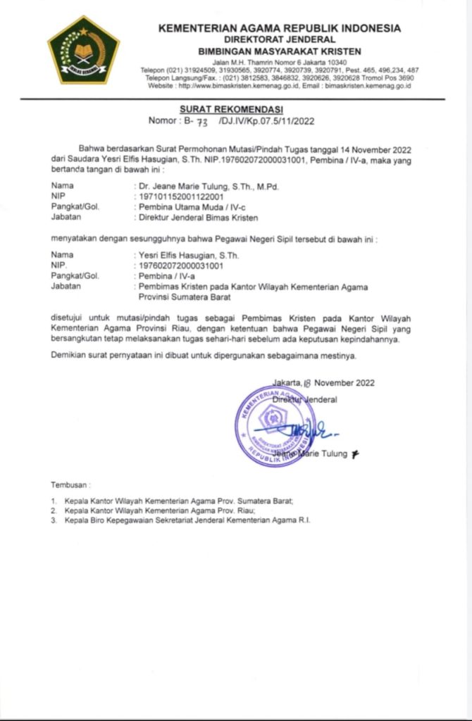 A. Bahwa pejabat yang melantik yaitu Kakanwil Riau dan Kabiro Kemenag RI telah mengabaikan surat Rekomendasi Dirjen Bimas Kristen tentang Mutasi dalam hal ini Kakanwil Riau dan Biro Kepegawaian Kemenag RI, diduga telah melanggar aturan selaku penerbit SK pejabat yang dilantik tersebut.