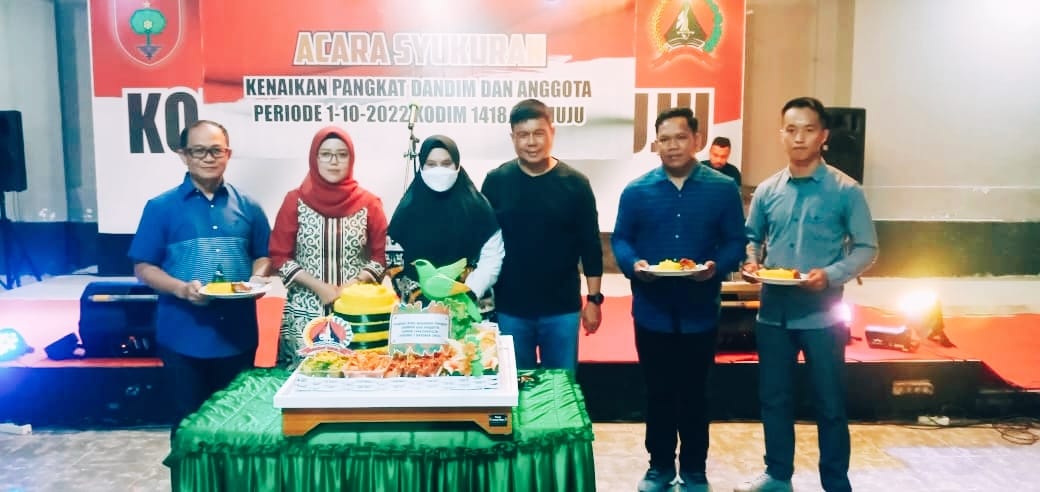 Acara di Aula Makodim 1418/Mamuju Jln Yos Sudarso Kel Binanga Kec Mamuju Kab Mamuju Prov Sulbar, di laksanakan Acara Syukuran Kenaikan Pangkat Dandim dan Anggota Periode 1-10-2022 Kodim 1418/Mamuju di Rangkaikan Pemotogan Tumpeng oleh Brigjen TNI Farouk Pakar, S.Pd., M.Han (Danrem 142/Tatag) yang dihadiri sekitar 200 Orang jumat 07 Oktober 2022