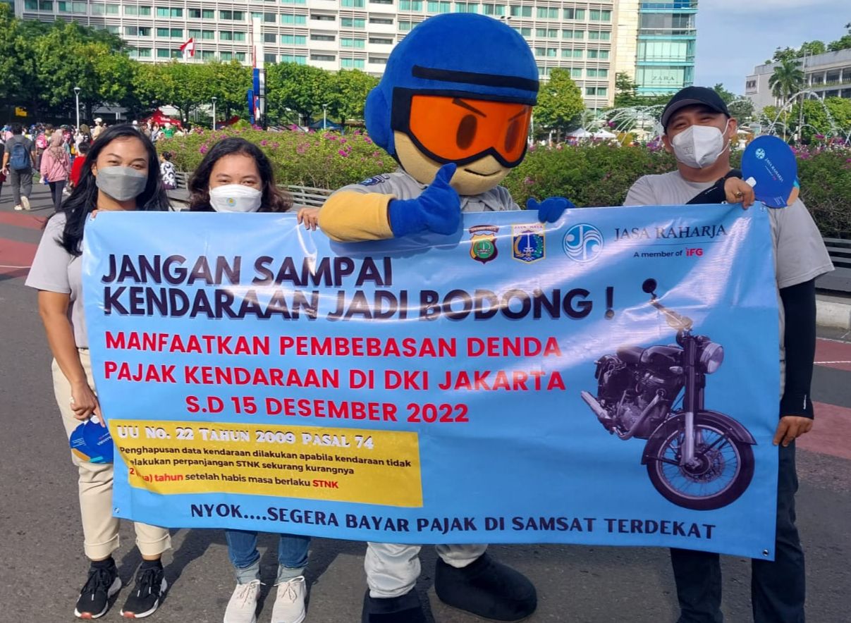 Jasa Raharja Cabang Utama Jakarta dan Jasa Raharja Kantor Pusat mengadakan sosialisasi pemutihan pajak kendaraan bertepatan dengan hari bebas kendaraan bermotor bertempat di kawasan Sudirman pada hari minggu 20 November 2022.