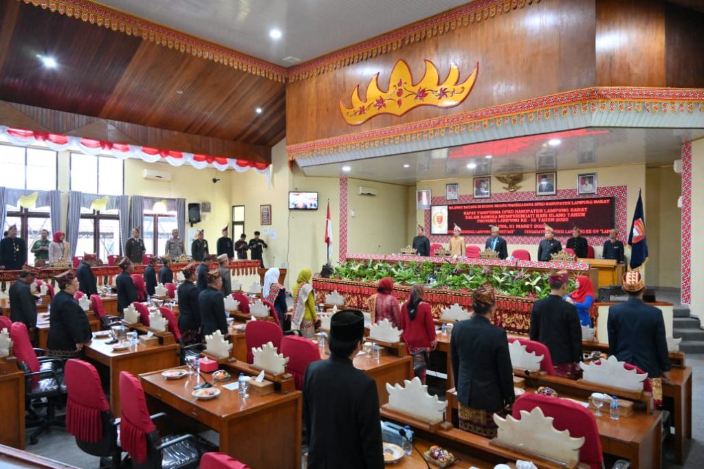 LAMPUNG – Dewan Perwakilan Rakyat Daerah (DPRD) Kabupaten Lampung Barat (Lambar) menggelar rapat paripurna istimewa dalam rangka memperingati Hari Ulang Tahun (HUT) Provinsi Lampung ke-59 dengan tema “Lampung bersinergi, Lampung berprestasi” yang diselenggarakan di Ruang Sidang Maghgasana DPRD Lambar, Selasa (21/03/23).