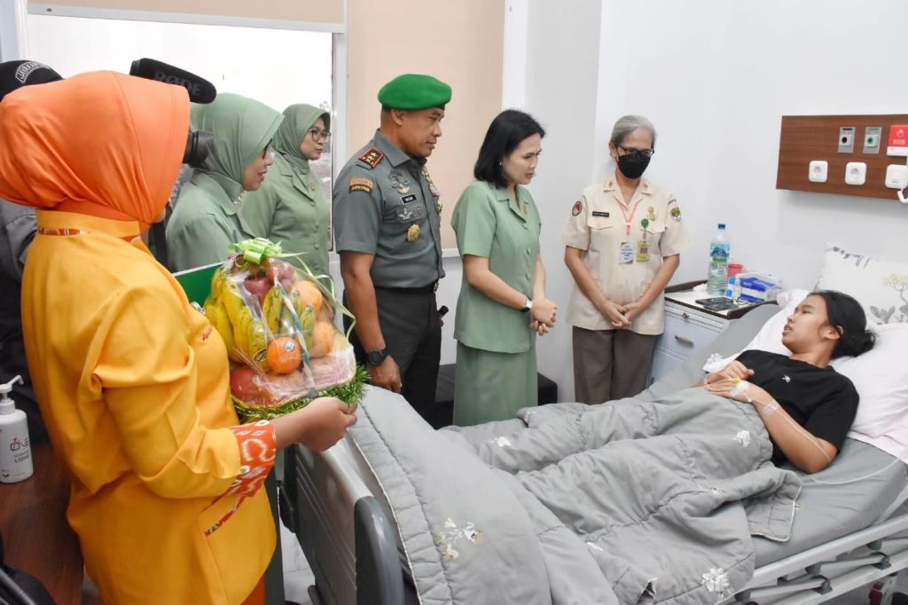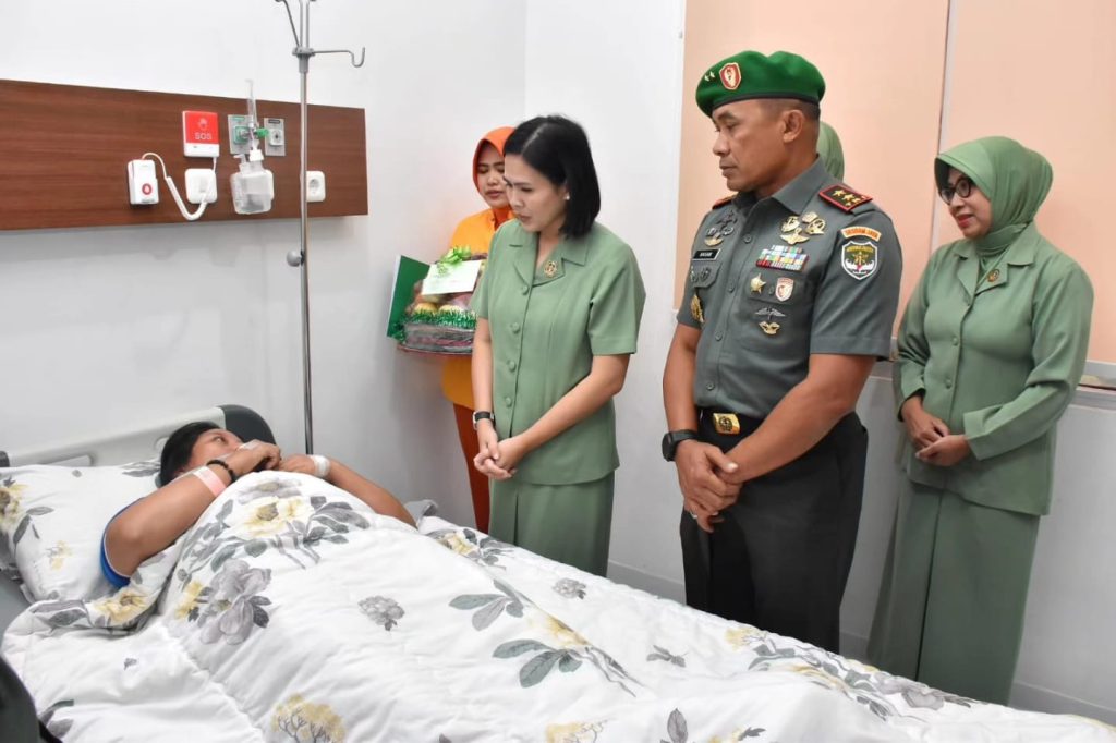 Pangdam Jaya didampingi Ketua Persit Kartika Chandra Kirana Daerah Jaya Ny. Ririx M. Hasan melanjutkan peninjauan ruangan dan menyapa pasien yang sedang dirawat, “semoga lekas sembuh, ya.”, Ucap Pangdam Jaya dan Ibu,