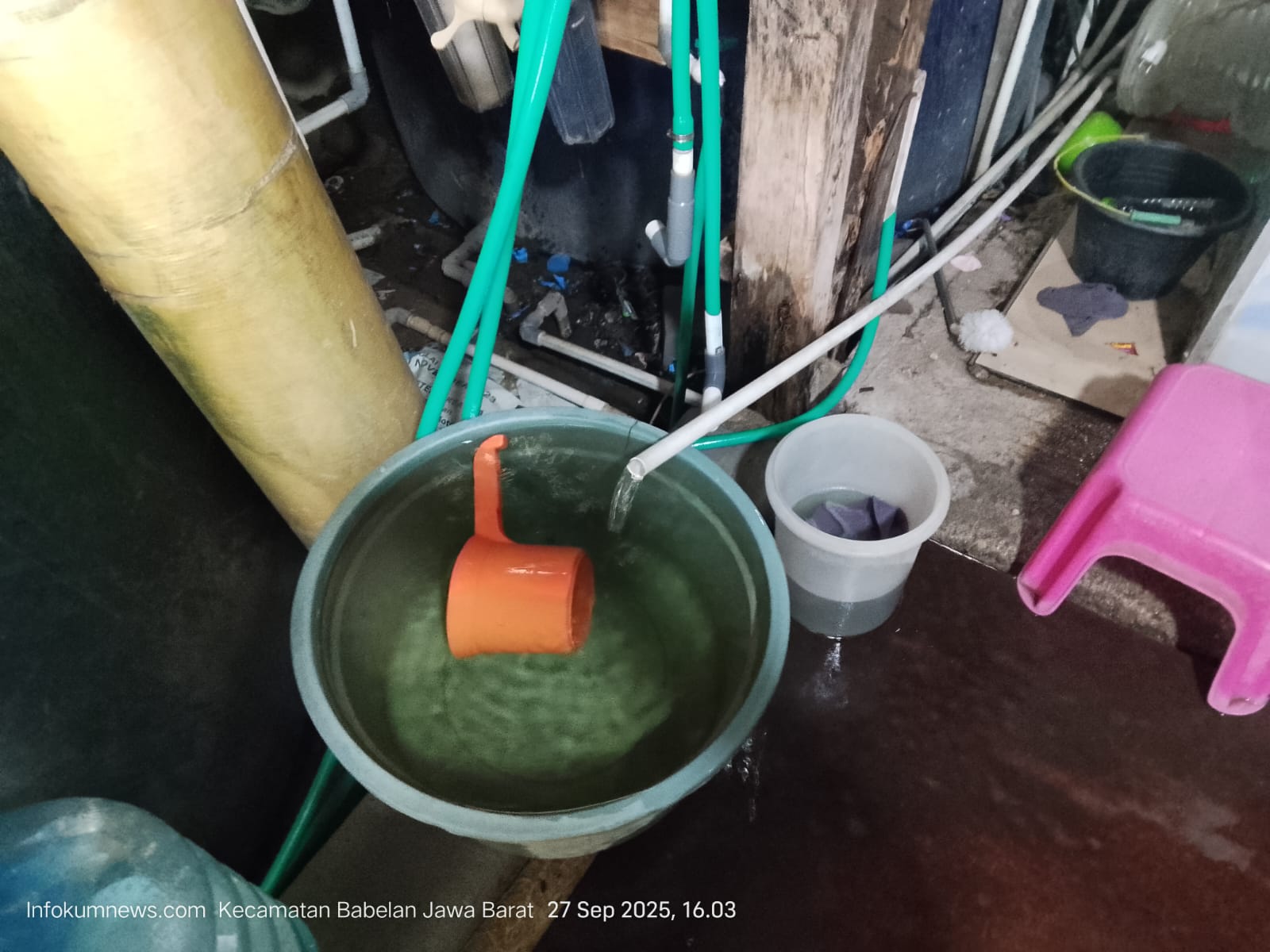 Sabtu 27 September 2025, Penemuan depot air isi ulang, mengunakan air keran ini berlokasi di samping kali Bekasi CBL Kebalen, Kec. Babelan, Kabupaten Bekasi, Jawa Barat 17610, yang menamakan Family depot isi ulang