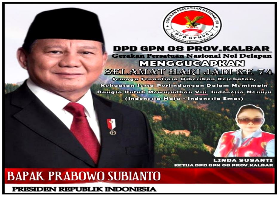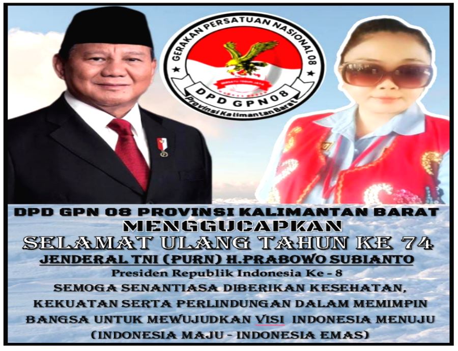 Jakarta | Hari jadi ke 74 tahun bapak Prabowo Subianto banyak mengalir di ucapkan, salah satunya dari seorang Aktifis Wanita yang dipercayakan menjadi Ketua DPD Gerakan Persatuan Nasional Nol Delapan (GPN 08) Prov. Kalimantan Barat Linda Susanti.