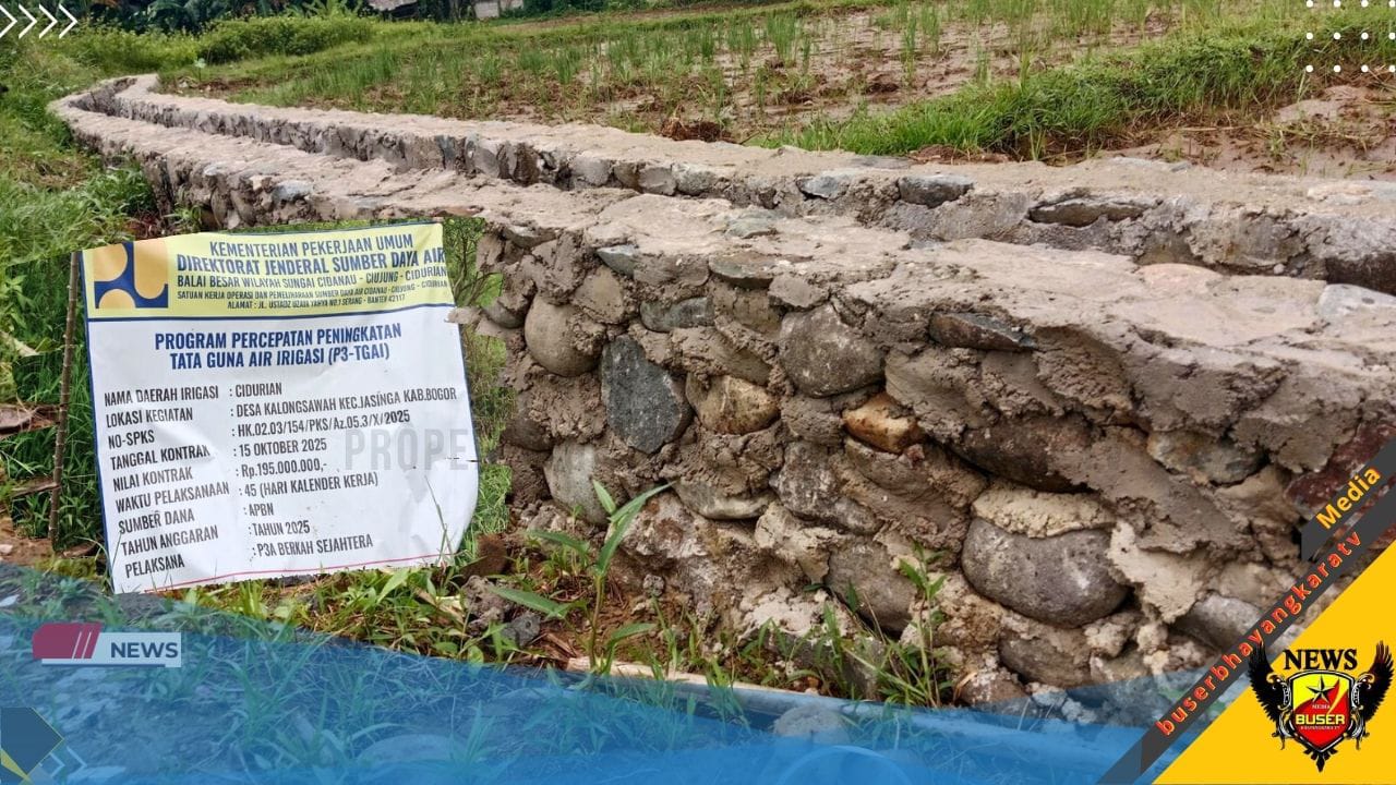 BOGOR, Buserbhayangkaratv – Proyek rehabilitasi irigasi di bawah Program Percepatan Peningkatan Tata Guna Air Irigasi (P3-TGAI) di Desa Kalong Sawah, Kecamatan Jasinga, Kabupaten Bogor, kini menjadi sorotan publik. Proyek senilai Rp 195.000.000 yang bersumber dari Anggaran Pendapatan dan Belanja Negara (APBN) Tahun 2025 ini diduga dikerjakan secara tidak sesuai spesifikasi teknis, standar kualitas, dan menggunakan material di bawah standar.