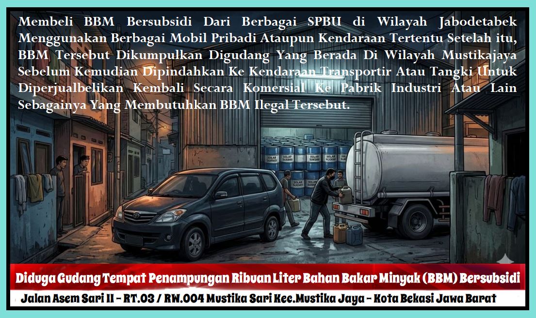 Setelah itu, BBM tersebut dikumpulkan di gudang yang berada di wilayah Mustikajaya sebelum kemudian dipindahkan ke kendaraan transportir atau tangki untuk diperjualbelikan kembali secara komersial.
