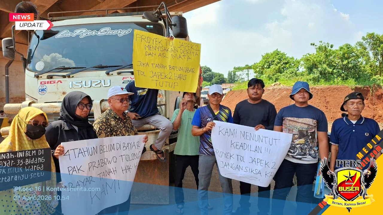 KABUPATEN BEKASI, Buserbhayangkaratv Sejumlah warga menghentikan aktivitas truk pengangkut tanah dalam proyek pembangunan Tol Jakarta-Cikampek (Japek) 2 Selatan di Desa Kertarahayu, Kecamatan Setu, Kabupaten Bekasi, Senin (27/4/2026). Aksi ini merupakan bentuk protes atas belum dibayarkannya ganti rugi lahan yang telah digunakan untuk proyek tersebut.